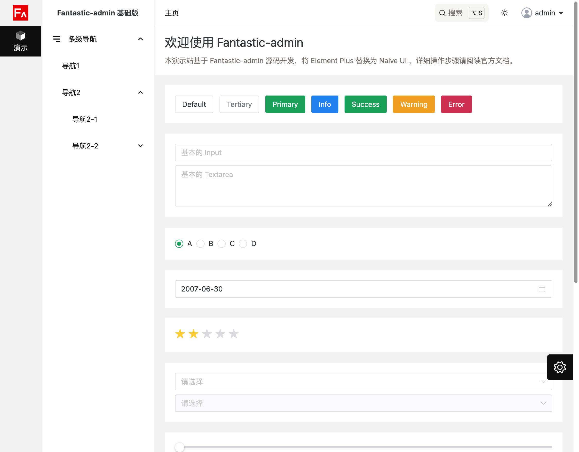 由于框架默认使用的是 Element Plus 组件库,并且演示源码中大量示例也使用了 Element Plus,如果你需要使用 Naive UI,请拉取框架源码分支,或者到 Github Releases 页面下载框架源码压缩包。