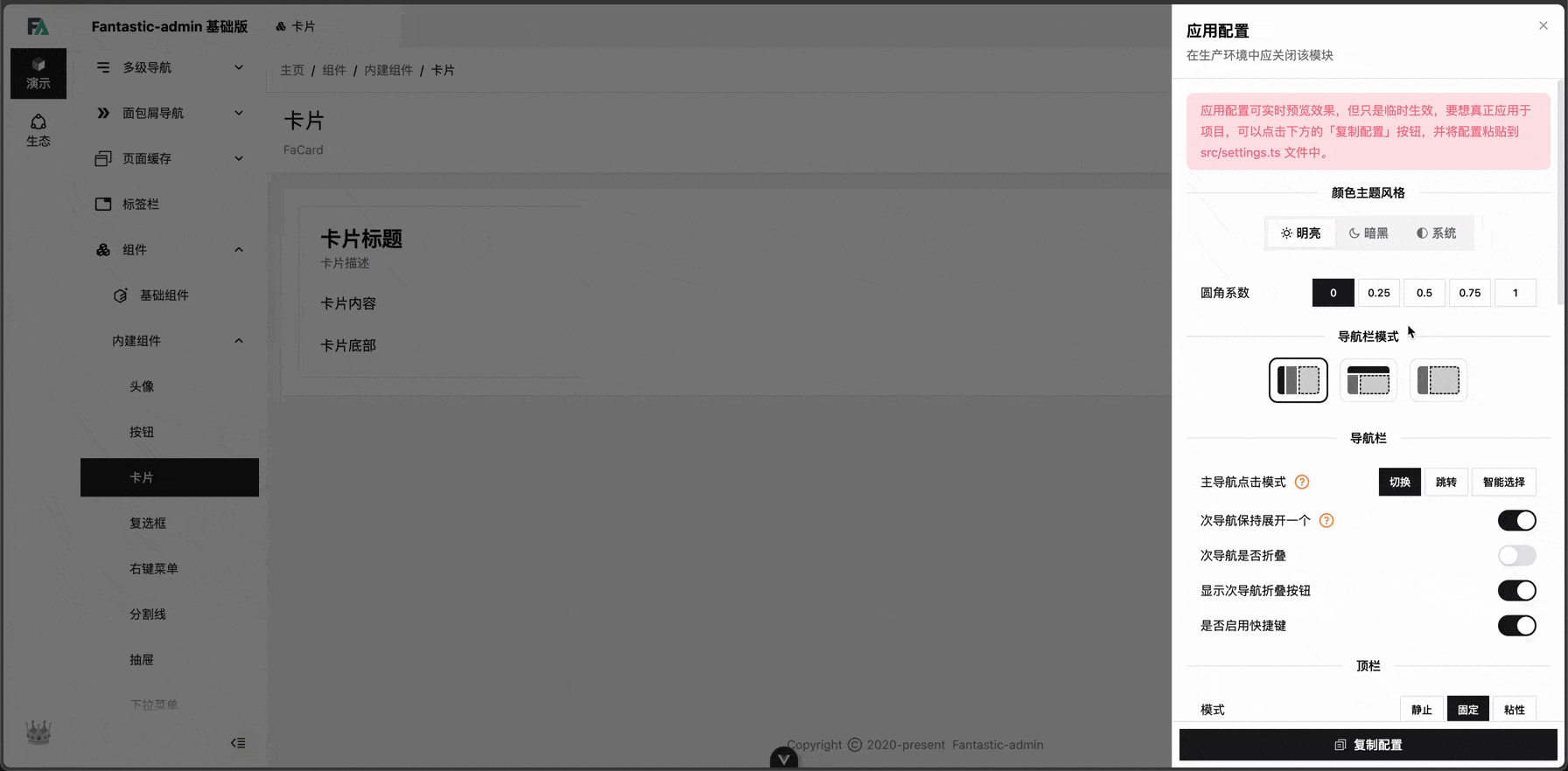 该设置会影响到框架中所有圆角组件的圆角系数,例如按钮、卡片、弹窗等。
